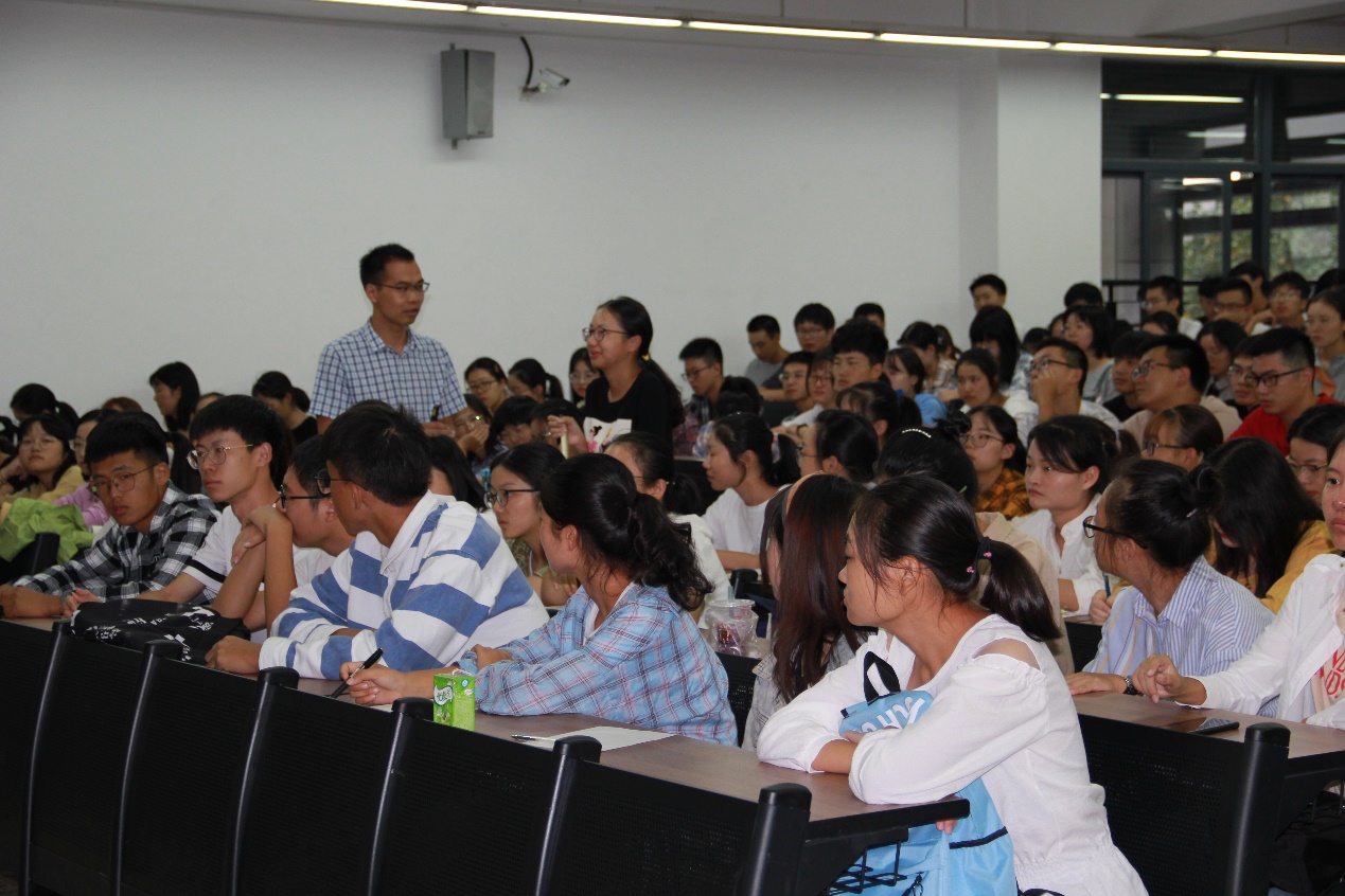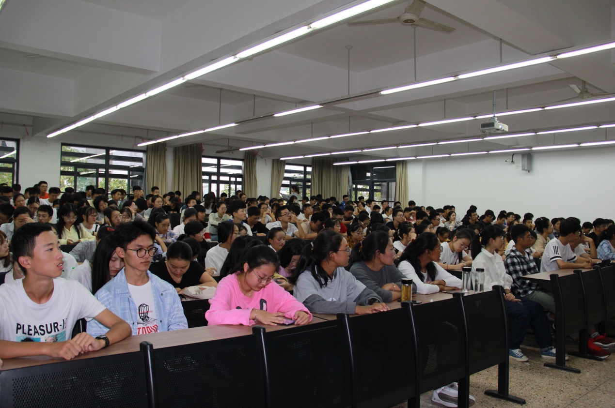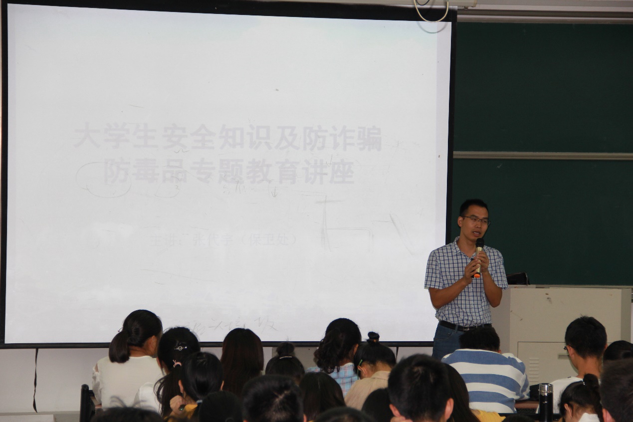 2019级大学生安全知识及防诈骗防毒品专题教育讲座在6号楼A303举行。本次讲座由汪秋月老师主持,保卫处副处长张代宇老师主讲,19级新生到场聆听。