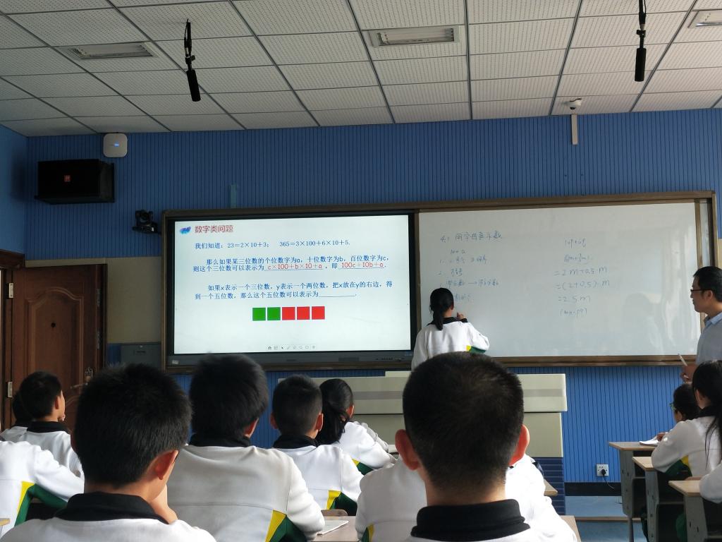 紧接着,通过实例进一步讲解用字母表示数的意义。通过例题引出知识点,如“字母与数之间用实心点连接或者省略不写”。与此同时,通过反例加深同学们对此知识点的印象。为了使学生们更好的掌握知识,深入理解其意义,例题的难度也是由易到难逐级递增。其中,“如果x表示一个三位数,y表示一个两位数,把x放在y的右边,得到一个五位数应该怎么表示”一题在本节课中起到了画龙点睛的作用。经过前面一系列的练习,学生们已经学会利用字母表示数以及掌握了简单的数量关系和规律,此题对于刚学习此类知识点的学生而言,既不脱离课堂所学知识,又仍需加一番思考才可得出。在讲解例题的过程中,孔老师首先让学生上讲台回答,学生们各抒己见,随后孔老师在学生的错误中进行修改得到正确答案,点出解题的关键在于观察x,y的末位处于哪一位。
